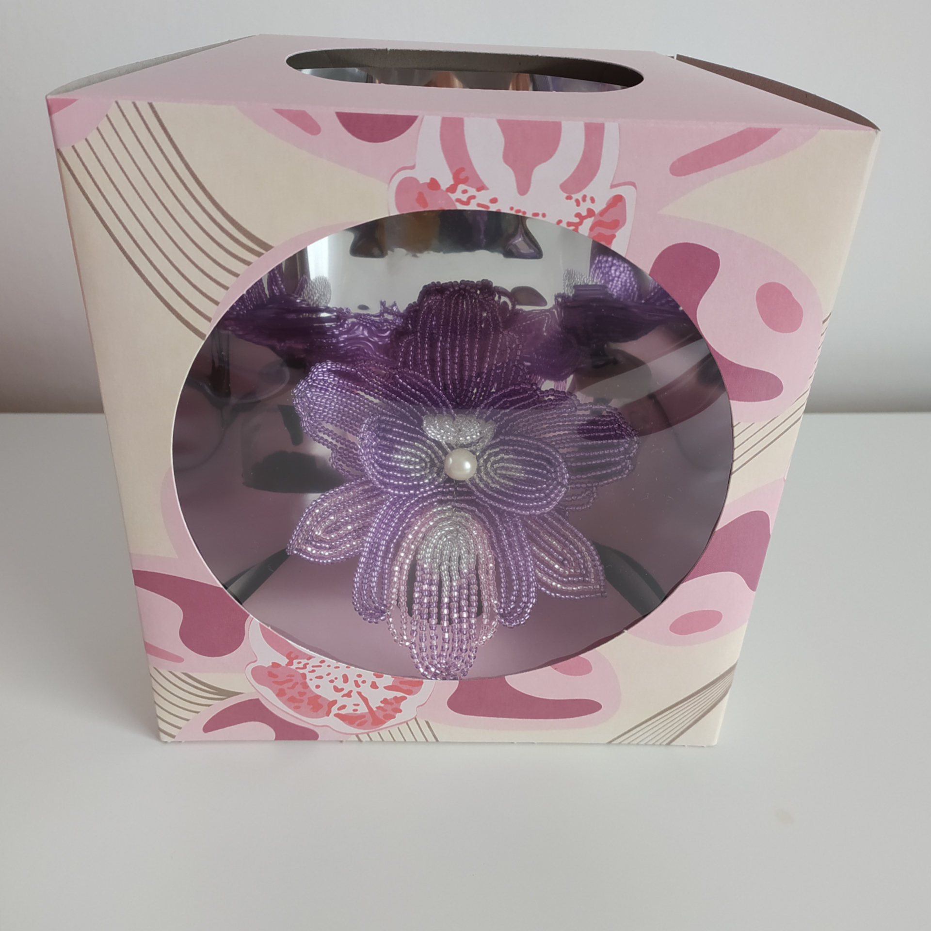 Květ orchideje z rokajlových korálků navlečených na bižuterním drátku v ozdobné papírové krabičce.